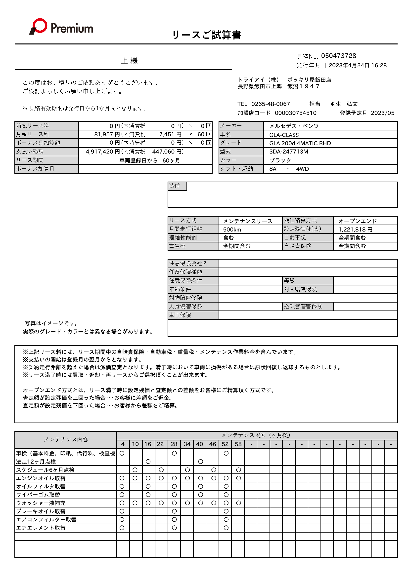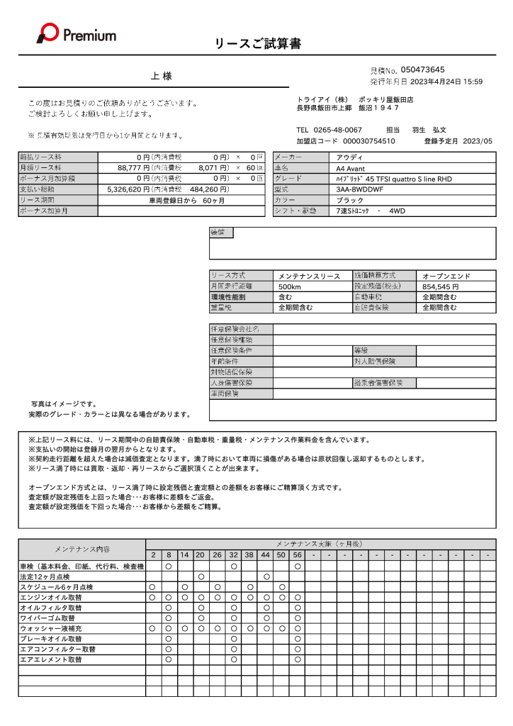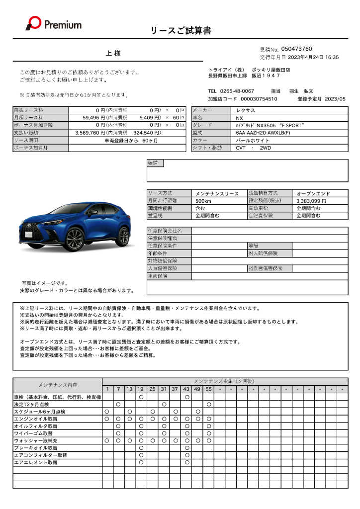 - まずはご来店の上、リースの仕組と乗りたいお車が決まっている場合、お見積りをおつくり致します。